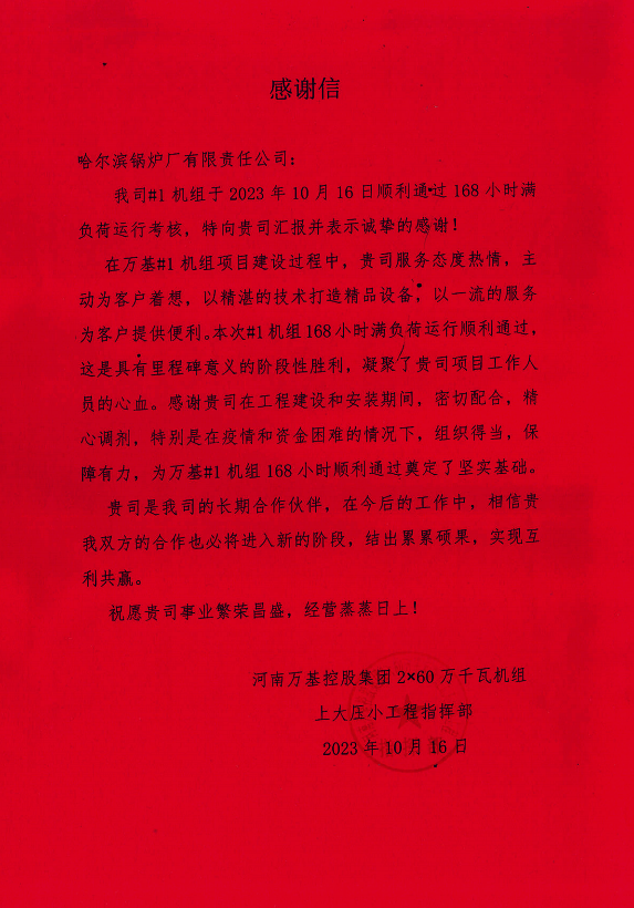 在河南萬基項目1號鍋爐設(shè)備投入商業(yè)運行之際,用戶專門發(fā)來感謝信,對哈電鍋爐提供的工作支持表示感謝,并表示希望繼續(xù)深化合作。