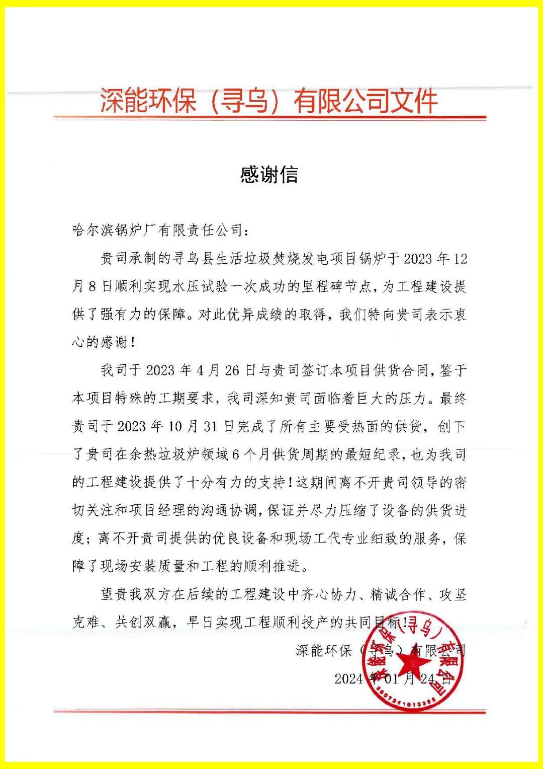 日前,哈電鍋爐研制的深能環保(尋烏)項目垃圾發電鍋爐設備進入到關鍵的調試環節,標志著項目即將步入試運行階段。深圳能源環保股份有限公司特地發來感謝信,對哈電鍋爐提供的工作支持表示感謝,并表達了繼續深化合作的希望。