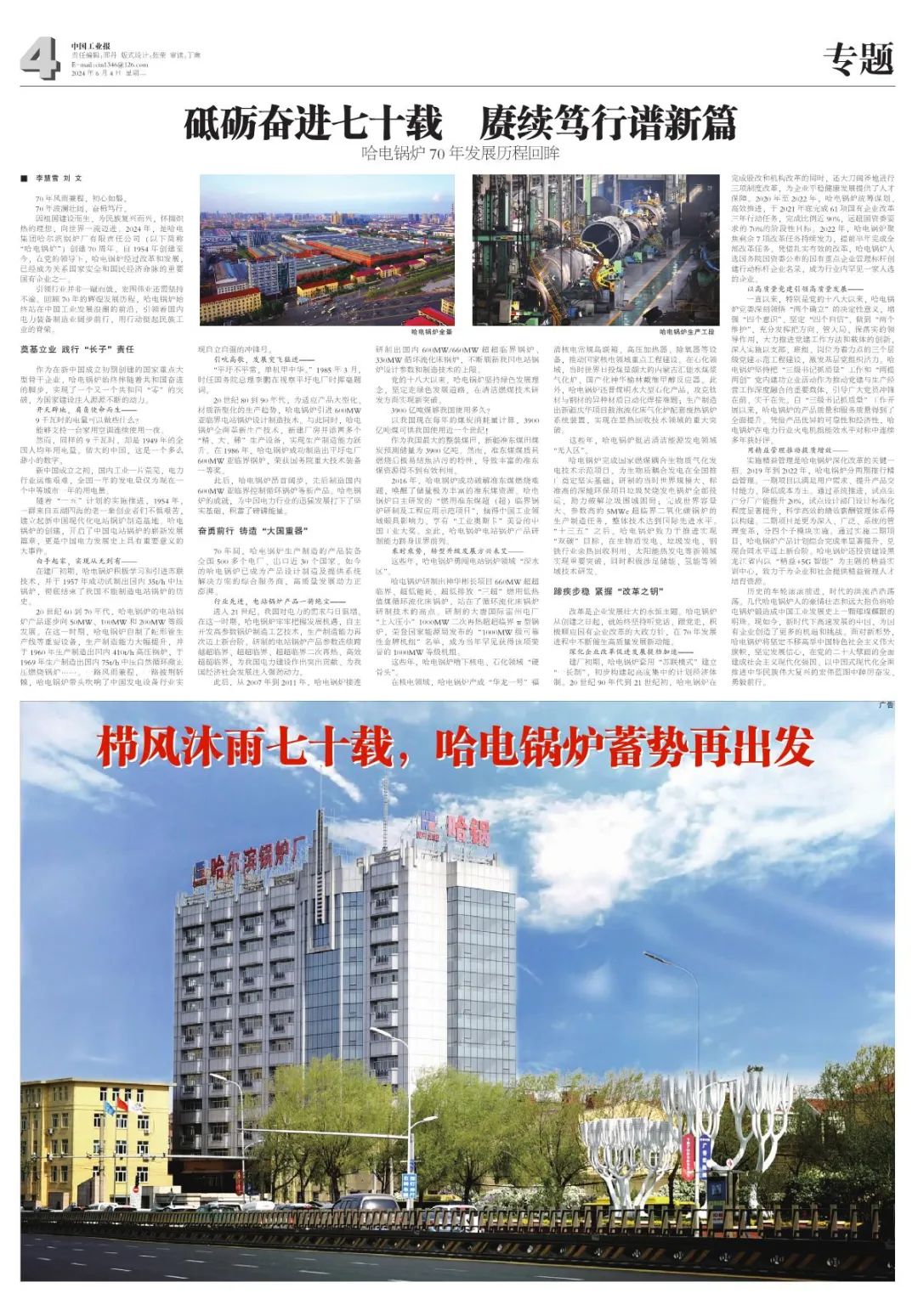 作為共和國裝備制造業的“長子”和電站鍋爐產業的“搖籃”,哈鍋創建70周年受到行業權威媒體的關注,“哈鍋70年發展歷程回眸”報道于創建70周年紀念日——6月4日當天,在中國工業報、中國電力報主要版面頭條位置刊發。